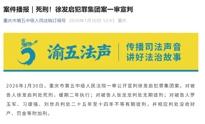 2026年1月30日,重庆市第五中级人民法院一审公开宣判徐发启犯罪集团案。对被告人徐发启判处死刑,缓期二年执行;对被告人张龙龙判处无期徒刑;对被告人罗玉军、习康强、刘世兵判处二十五年至十四年不等有期徒刑,并相应判处没收财产、罚金等附加刑。