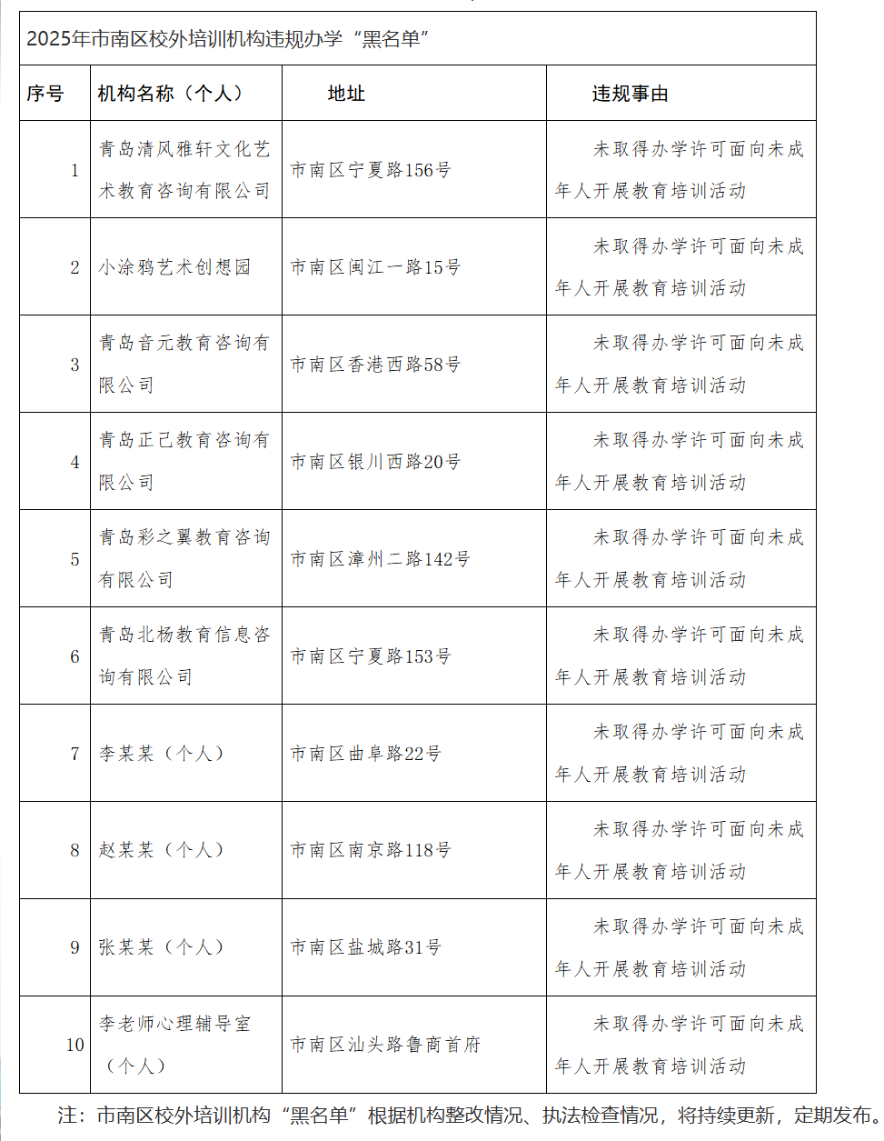 根据近期查处情况,现公布一批校外培训机构违规办学“黑名单”,该名单中的机构不具备相关培训资质,未进行预收费资金监管,请家长切勿选择。(青岛日报/观海新闻记者 曹森)