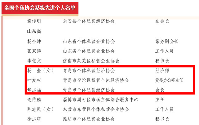 青岛日报社/观海新闻1月30日讯 为选树典型、鼓励先进,充分展示个体工商户的精神面貌和时代风采,激发个私协会和协会工作人员的积极性和创造性,中国个体劳动者协会近日决定,授予张国庆等492名个体工商户“全国先进个体工商户”称号,授予北京市东城区私营个体经济协会等260个单位“全国个私协会系统先进单位”称号,授予方文琴等379名工作人员“全国个私协会系统先进个人”称号。