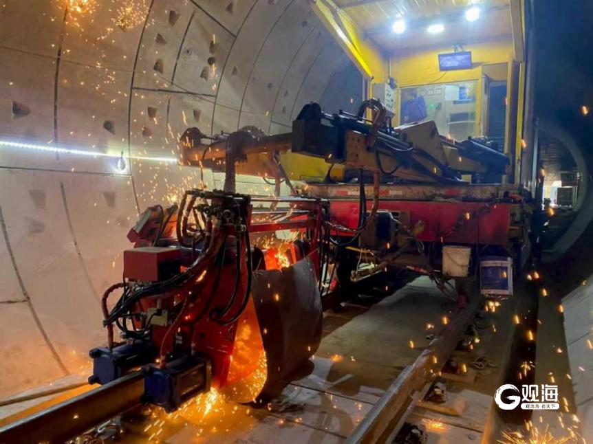 深入地下30多米的地铁隧道,一架比三轮代步车略大的设备架设在铺设好的钢轨上,发出低声的鸣响,声响与怠速中的轿车相当。伸出的机械臂里,是取代柴油机的新能源焊轨机。随着滚烫的铁屑在隧道里划出一道道绚丽的弧线,两根25米长的标准轨精准对接。焊接一节焊头,大概需要五分钟左右。
