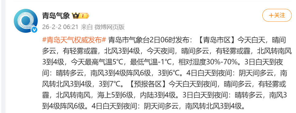 青岛日报社/观海新闻2月2日讯 观海新闻自“青岛气象”获悉,青岛市气象台2日06时发布:【青岛市区】今天白天,晴间多云,有轻雾或霾,北风3到4级,今天夜间,晴间多云,有轻雾或霾,北风转南风3到4级,今天最高气温5℃,最低气温-1℃,相对湿度30%-70%。3日白天到夜间:晴转多云,南风3到4级阵风6级,3到6℃。4日白天到夜间:阴天间多云,南风转北风3到4级,3到7℃。