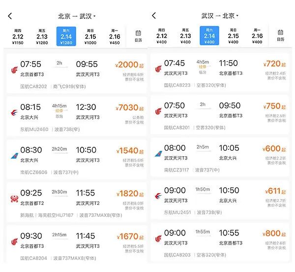 以1月30日价格为例,铁路12306平台显示2月14日从北京到武汉的经济舱票价千元不等,而“反向出行”票价优势显著。(图片截取自铁路12306客户端)