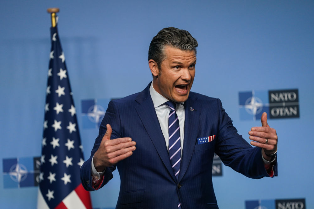 2025年10月15日,在比利时布鲁塞尔,美国国防部长赫格塞思在与北约秘书长吕特共同举行的记者会上发言。新华社记者彭子洋摄