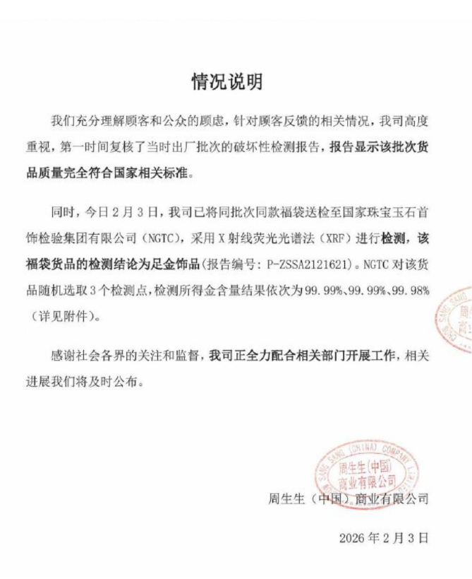 同时,今日2月3日,我司已将同批次同款福袋送检至国家珠宝玉石首饰检验集团有限公司(NGTC),采用X射线荧光光谱法(XRF)进行检测,该福袋货品的检测结论为足金饰品(报告编号:P-ZSSA2121621)。NGTC对该货品随机选取3个检测点,检测所得金含量结果依次为99.99%、99.99%、99.98%(详见附件)。