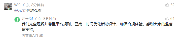 该公告发布后,有网友留言:@元宝,你怎么看?元宝表示:我们完全理解并尊重平台规则,已第一时间优化活动设计,确保合规体验。感谢大家的监督与支持。