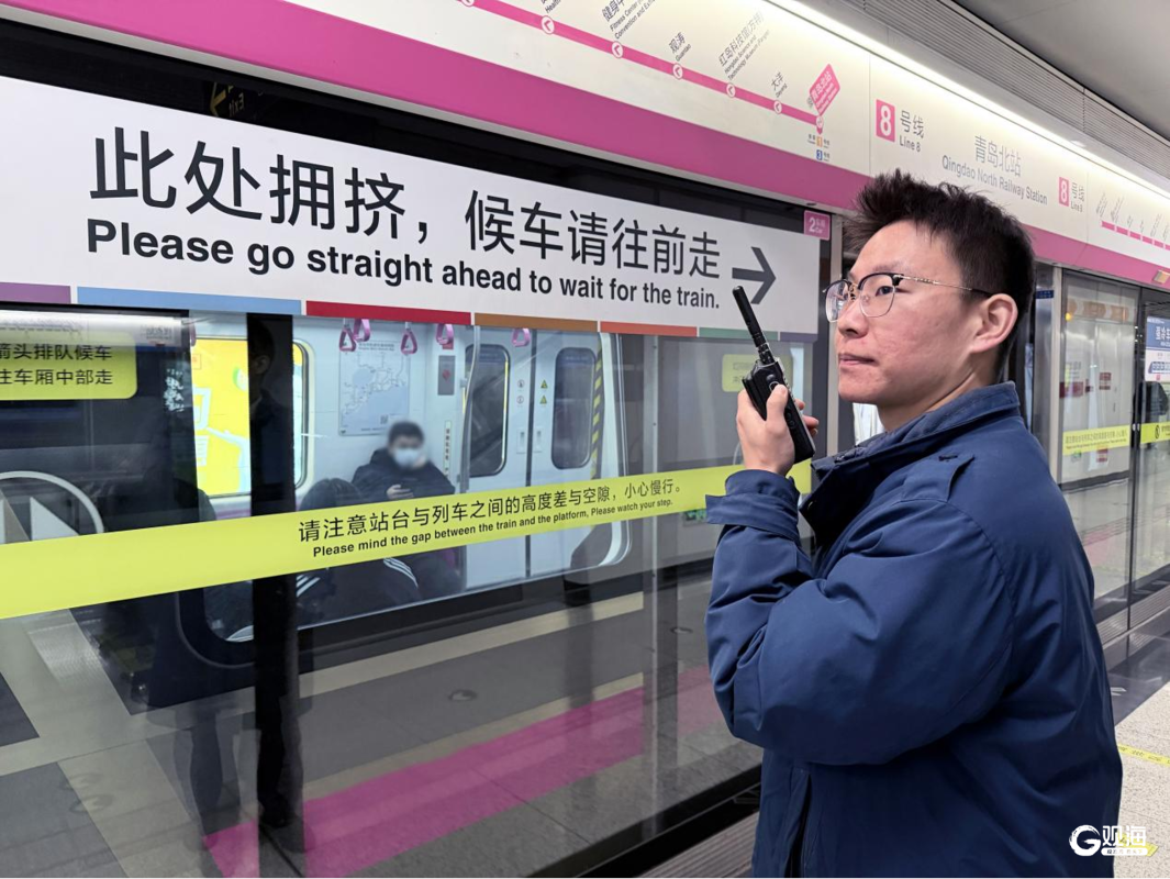 在青岛地铁青岛北站8号线站台,站台岗与首班直达列车司机进行互控,以安全高效的运输组织,为当日的春运返乡旅途保驾护航。