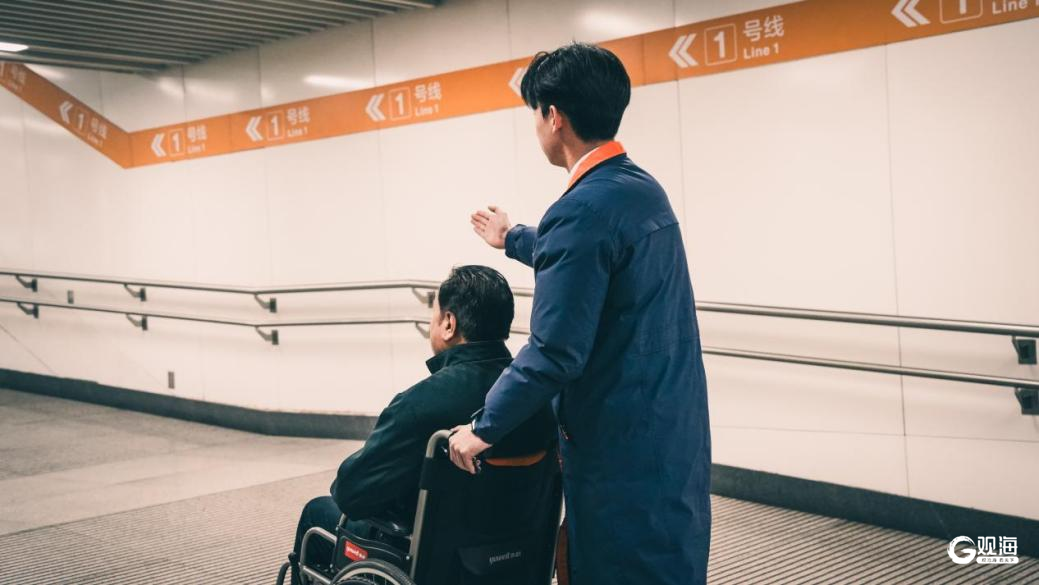 青岛地铁青岛站,站务员推着轮椅护送一名刚下火车的老年乘客穿过站厅通道,准备前往站台乘坐地铁。通过春运联动服务机制,有特殊需要的旅客可在工作人员全程陪同下,顺畅完成国铁和地铁的无缝换乘。
