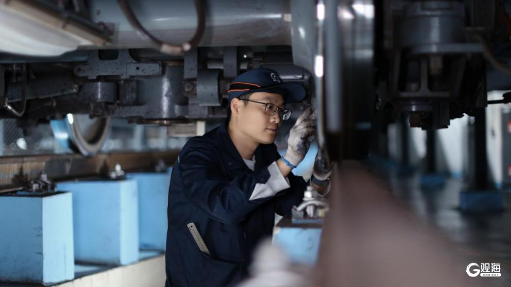 在青岛地铁海泊桥(海慈医疗)站站台,站台门检修工对门体锁紧装置开展精准检修。