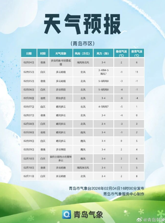 【青岛市区】今天夜间,多云间晴,有轻雾或霾,南风转北风3到4级,明天白天,多云间晴,北风3到4级转4到5级阵风7级,相对湿度40%-90%,明天最低气温-1℃,最高气温11℃。