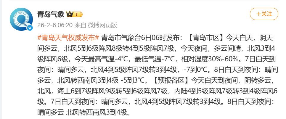 青岛日报社/观海新闻2月6日讯 观海新闻自“青岛气象”获悉,青岛市气象台6日06时发布:【青岛市区】今天白天,阴天间多云,北风5到6级阵风8级转4到5级阵风7级,今天夜间,多云间晴,北风3到4级阵风6级,今天最高气温-4℃,最低气温-7℃,相对湿度30%-60%。7日白天到夜间:晴间多云,北风4到5级阵风7级转3到4级,-7到0℃。8日白天到夜间:晴间多云,北风转西南风3到4级 -5到3℃。