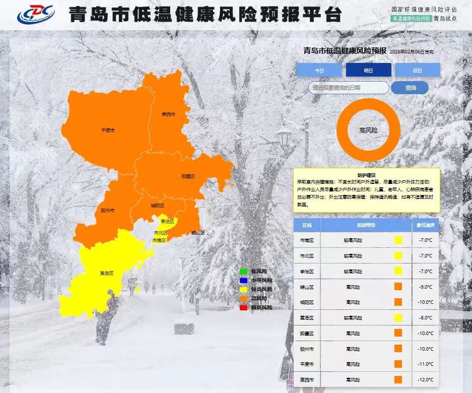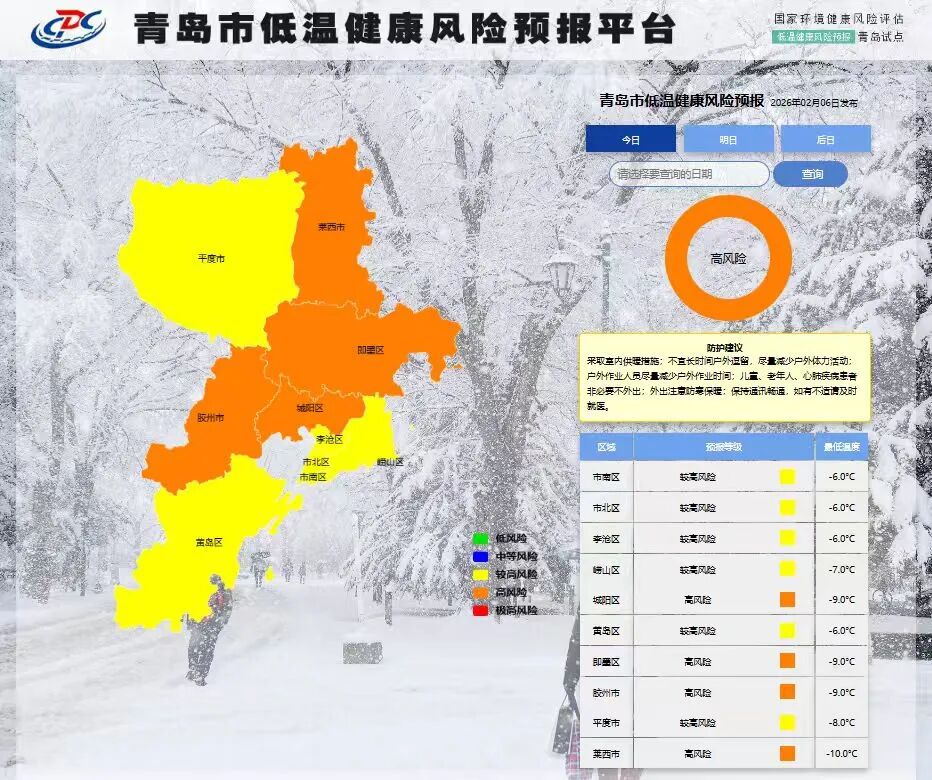青岛日报社/观海新闻2月6日讯 6日,观海新闻记者从青岛市疾控中心低温健康风险预报平台上获悉,青岛近两日降温超10℃,将出现较高及以上健康风险。