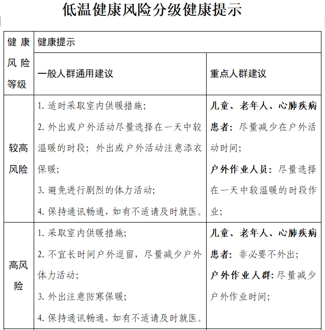 预计2月6日20时至2月7日20时,崂山区、城阳区、即墨区、胶州市、平度市、莱西市低温健康风险高(橙色);其余地区低温健康风险较高(黄色)。