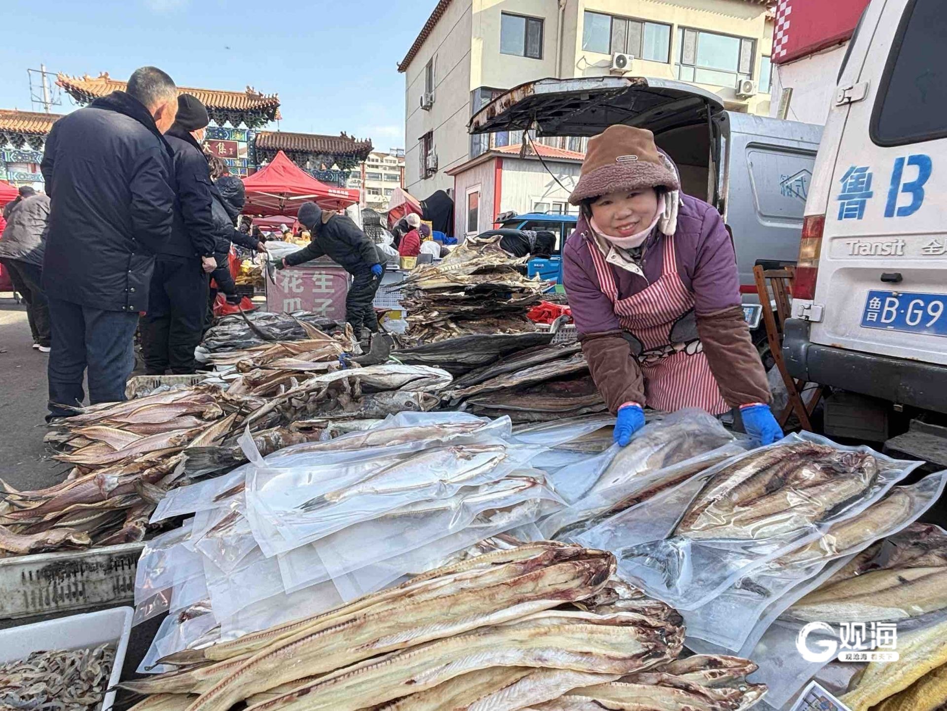 “干鱼系列我这里有20多个品种,古力鱼、老板鱼、墨鱼、鱿鱼、鳗鳞鱼、面包鱼、鲈鱼、安康鱼、海兔子鱼,还有一卤鲜鲅鱼,尤其受欢迎。”大集上的商户陈爱霞介绍,虽然现在借助电商平台可以把当地特色的干海产品销到全国,但赶集仍然是主要的销售渠道。“很多老年人都是认准线下选购,还有不少外地游客来逛百年大集,尤其是腊月里的年集,人们不仅来置办年货,也来感受年俗。作为王哥庄大集的一份子,我们也很骄傲。”陈爱霞说。