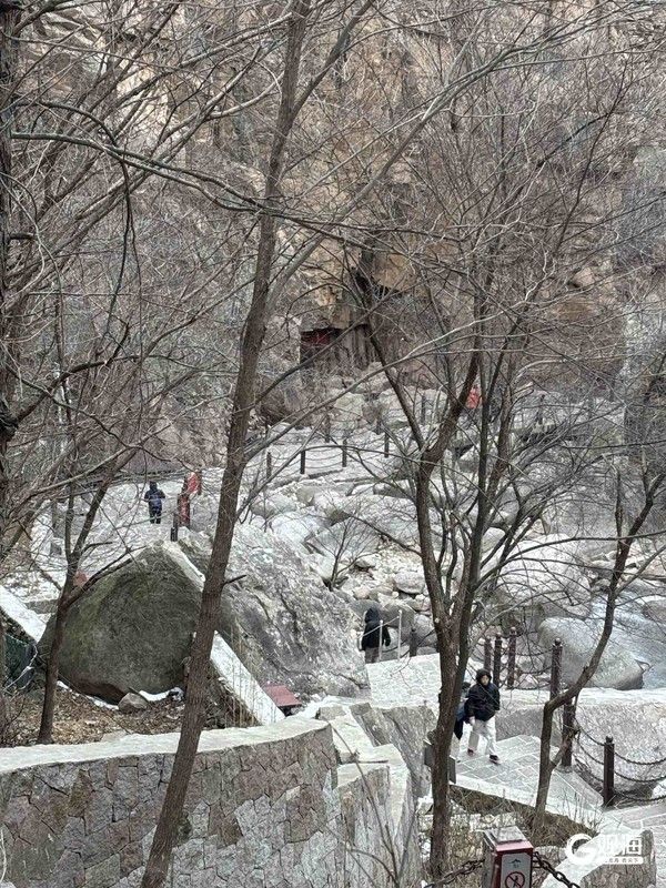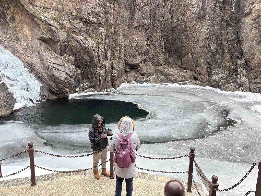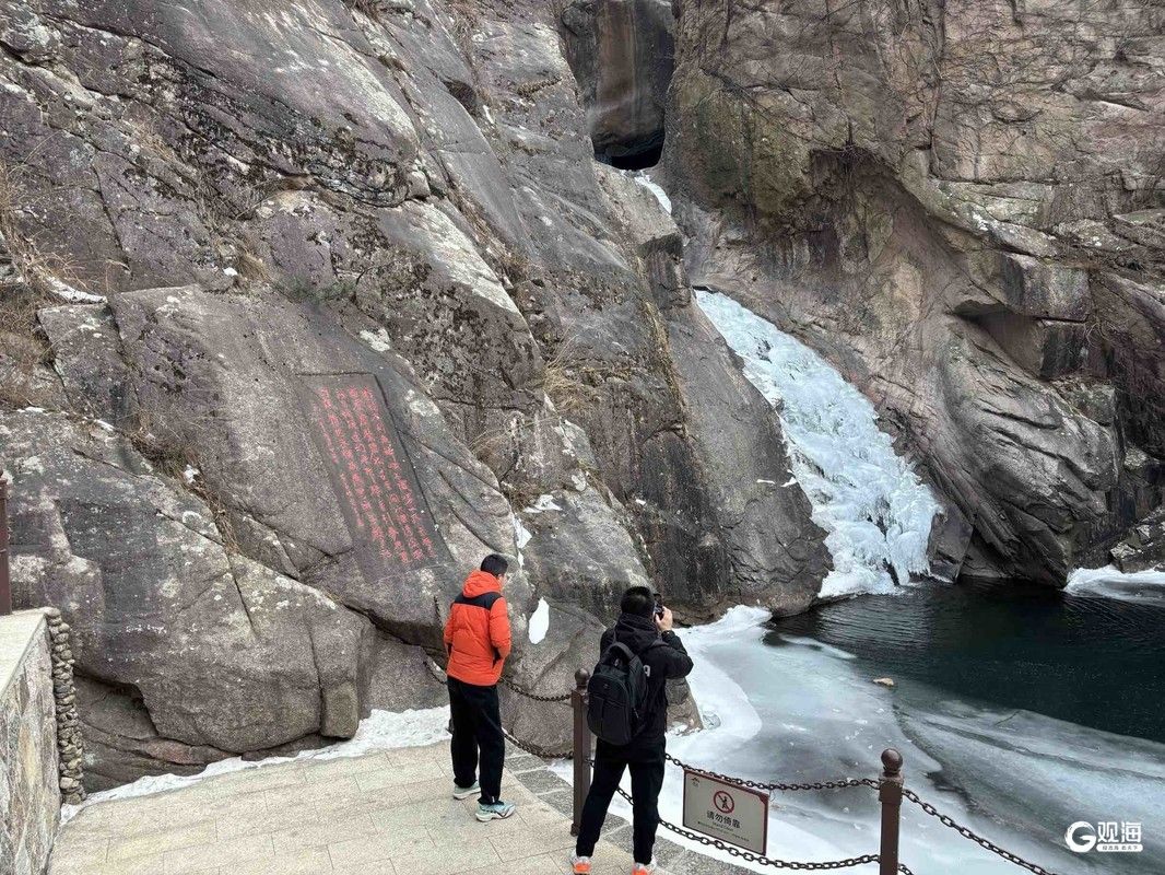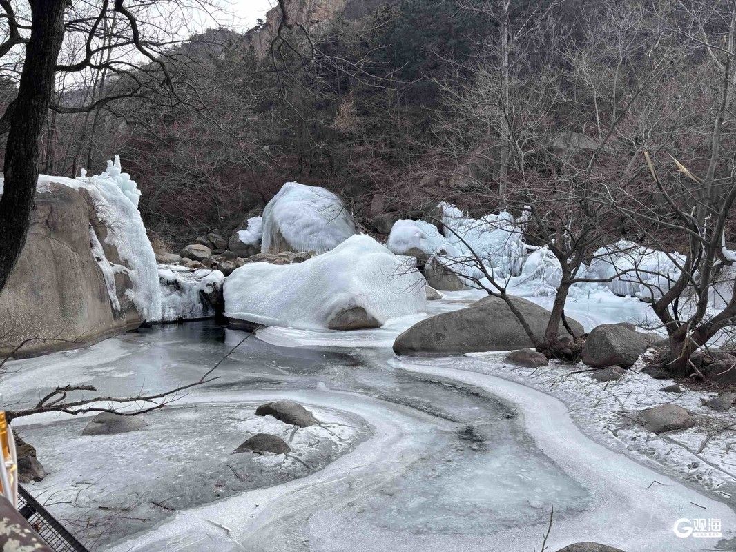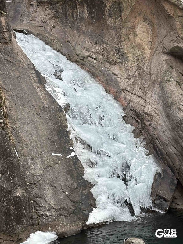 冷翠峡是当之无愧的C位。巨型冰瀑从高空垂落,层层叠叠的冰柱如水晶帘幕悬挂崖壁,阳光照射下泛着清冷的蓝光。站在观景台仰拍,能将冰瀑的壮阔全景尽收眼底,与冰瀑上方的“虎头”岩石同框,氛围感直接拉满;内四水,冰封的水面如镜面般平滑,倒映着银装素裹的山谷与雾凇,随手一拍就是“天空之镜”既视感;潮音瀑,作为崂山名瀑,冬季的潮音瀑褪去了往日的奔腾,凝结成层层叠叠的冰柱,宛如一座晶莹剔透的佛塔。靠近时能清晰听到冰下潺潺的流水声,动静交织间,更添几分神秘感;俱化潭,藏在山谷中的小众打卡点,冰瀑规模虽小但精致灵动,潭边的树挂与冰面相映成趣,站在桥上拍摄视角最佳,随手就能拍出清新感大片。(青岛日报/观海新闻记者 马晓婷 文/图/视频)