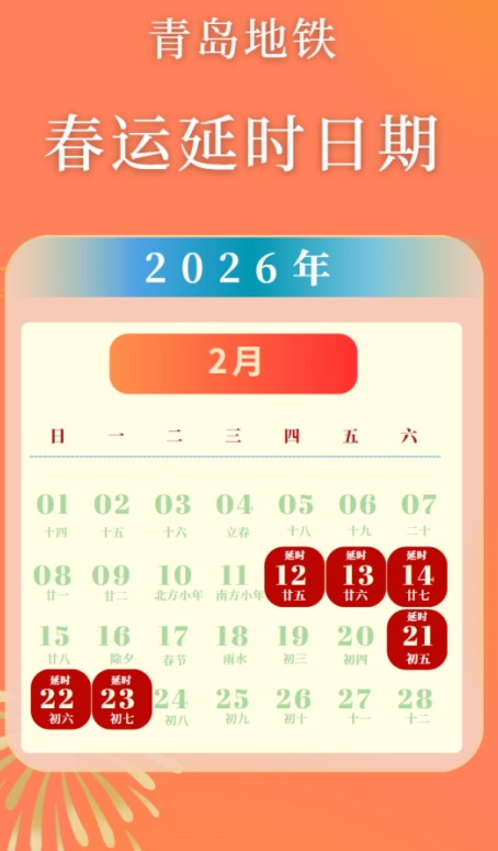 为全力保障您的春运旅途便捷顺畅,2月12-14日(腊月二十五至二十七,共3天)、2月21-23日(正月初五至初七,共3天),青岛地铁1、3号线首车时间提前、末车时间延后,同时8号线将在早间05:20及夜间23:00各增开直达列车1列。