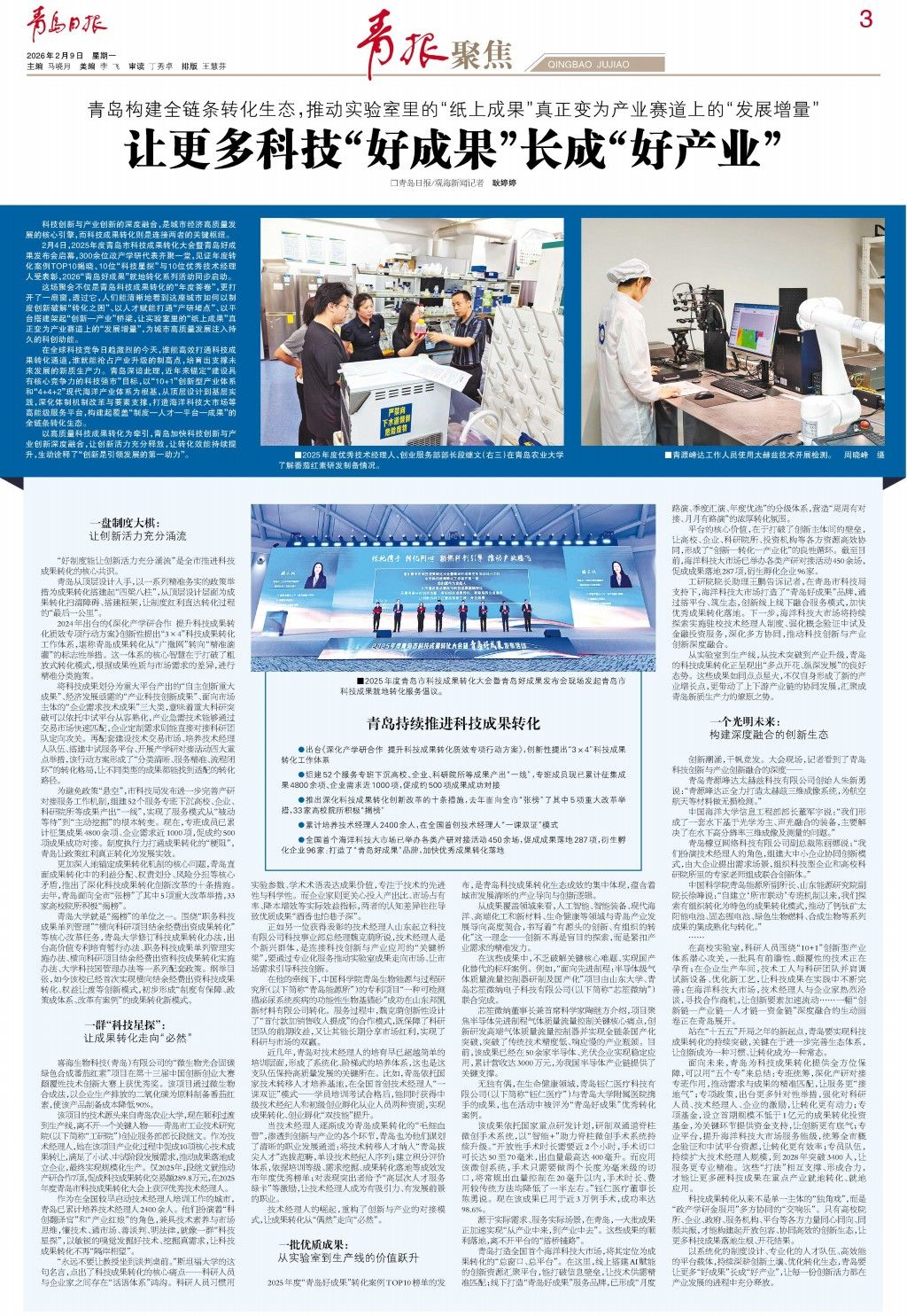 以系统化的制度设计、专业化的人才队伍、高效能的平台载体,持续深耕创新土壤、优化转化生态,青岛要让更多“好成果”长成“好产业”,让每一份创新活力都在产业发展的进程中充分释放。(青岛日报/观海新闻记者 耿婷婷)