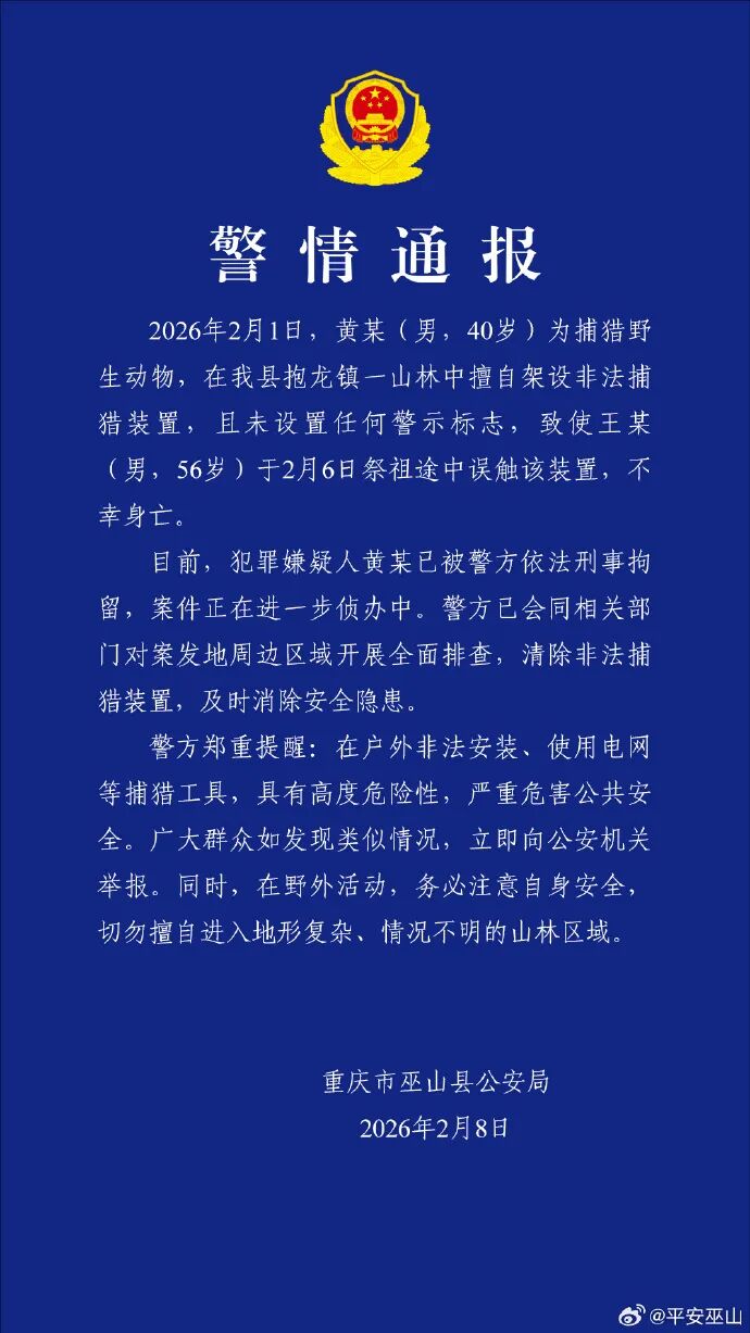 2月8日,重庆市巫山县公安局通报:2026年2月1日,黄某(男,40岁)为捕猎野生动物,在巫山县抱龙镇一山林中擅自架设非法捕猎装置,且未设置任何警示标志,致使王某(男,56岁)于2月6日祭祖途中误触该装置,不幸身亡。目前,犯罪嫌疑人黄某已被警方依法刑事拘留,案件正在进一步侦办中。警方已会同相关部门对案发地周边区域开展全面排查,清除非法捕猎装置,及时消除安全隐患。