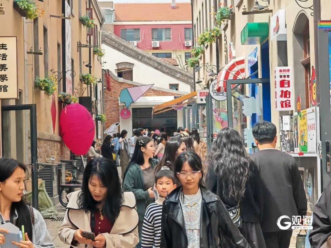 不远处,Morning&Morton清真西餐厅门口的复古黑框镜面装饰前,人群熙攘。年轻人排着队拍照,来自韩国的申俊英和好友也在其中,她们一边拍照,一边在社媒上同步发出,带上“青岛”“银鱼巷”等tag。据了解,随着周五下班去中国旅游的持续火爆,银鱼巷、中山路等颇具中国传统风情与现代魅力交织的街区,已经成为韩国社媒上的网红打卡地。