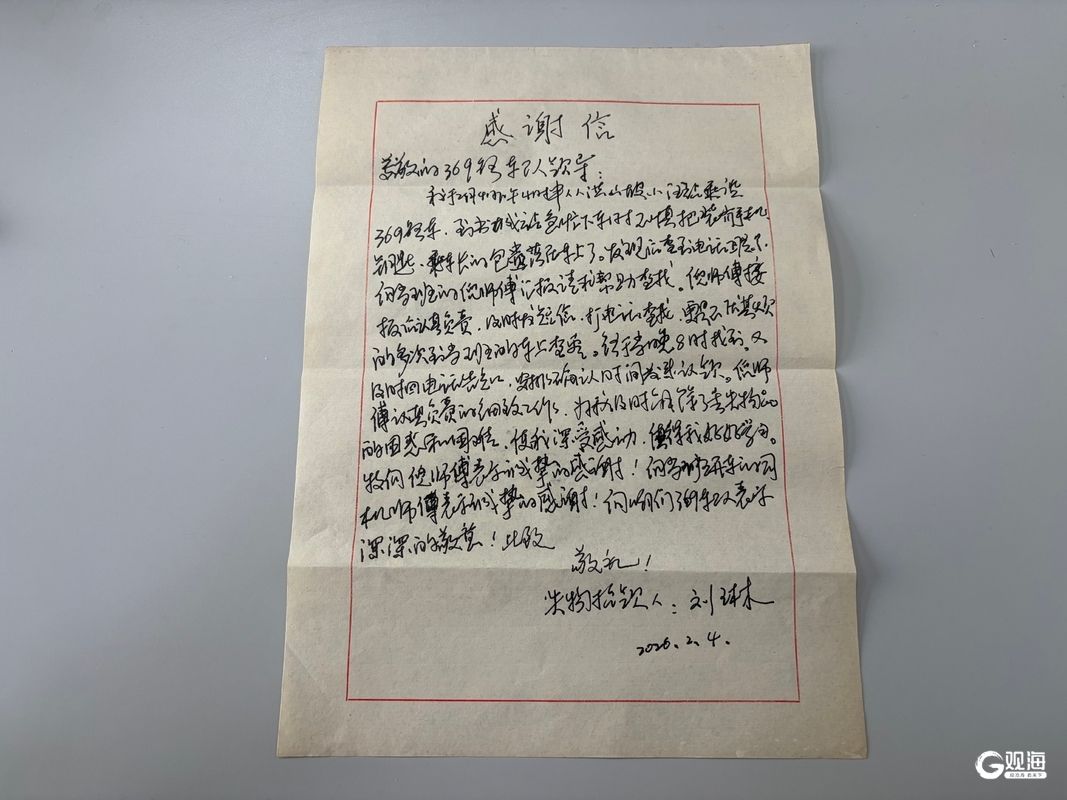 市民刘先生亲笔手写的感谢信