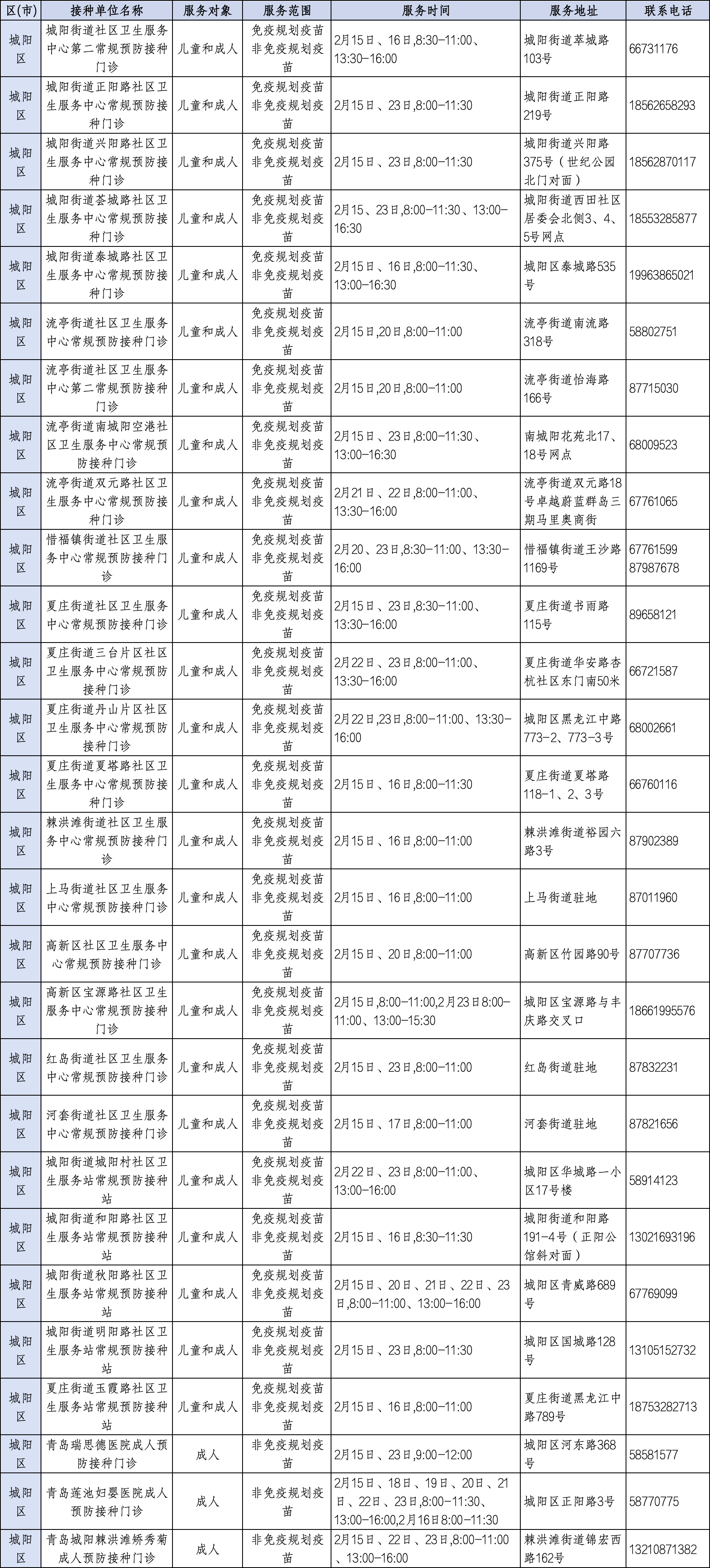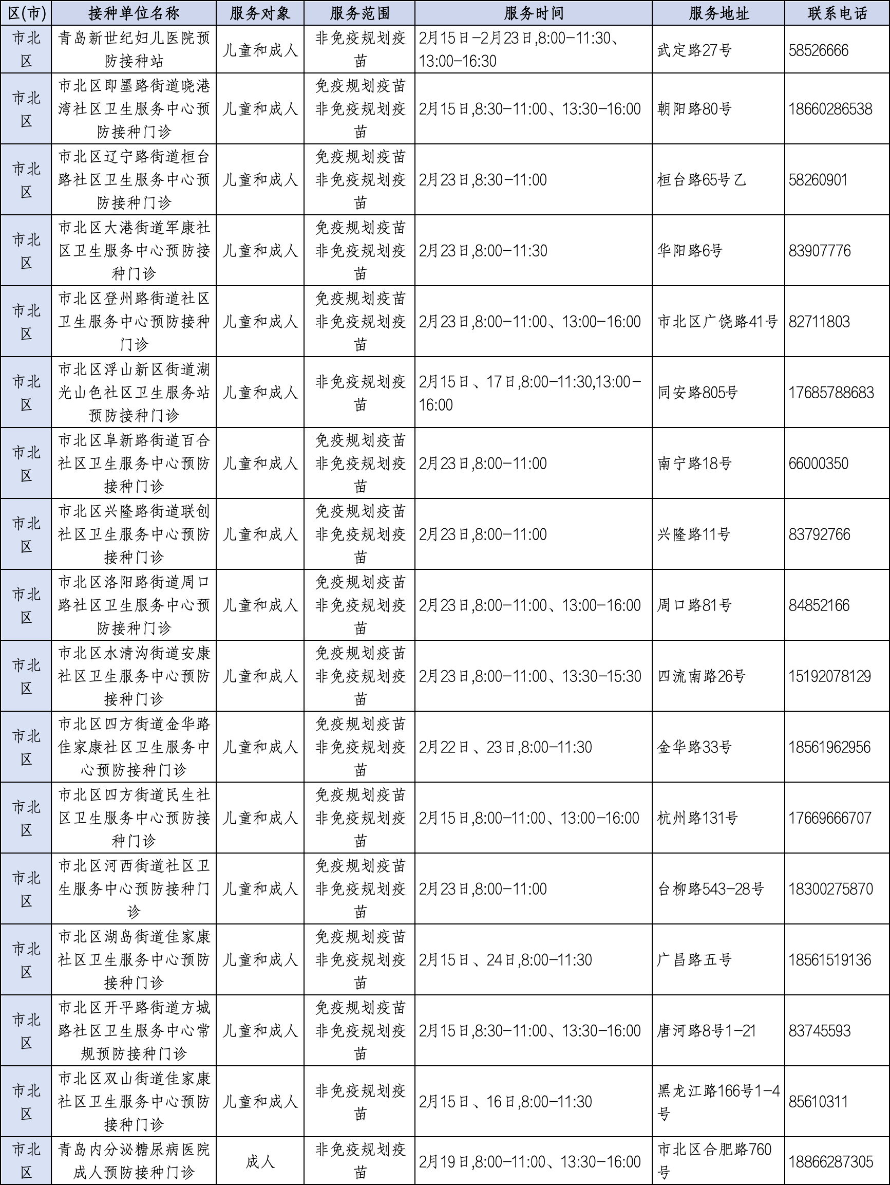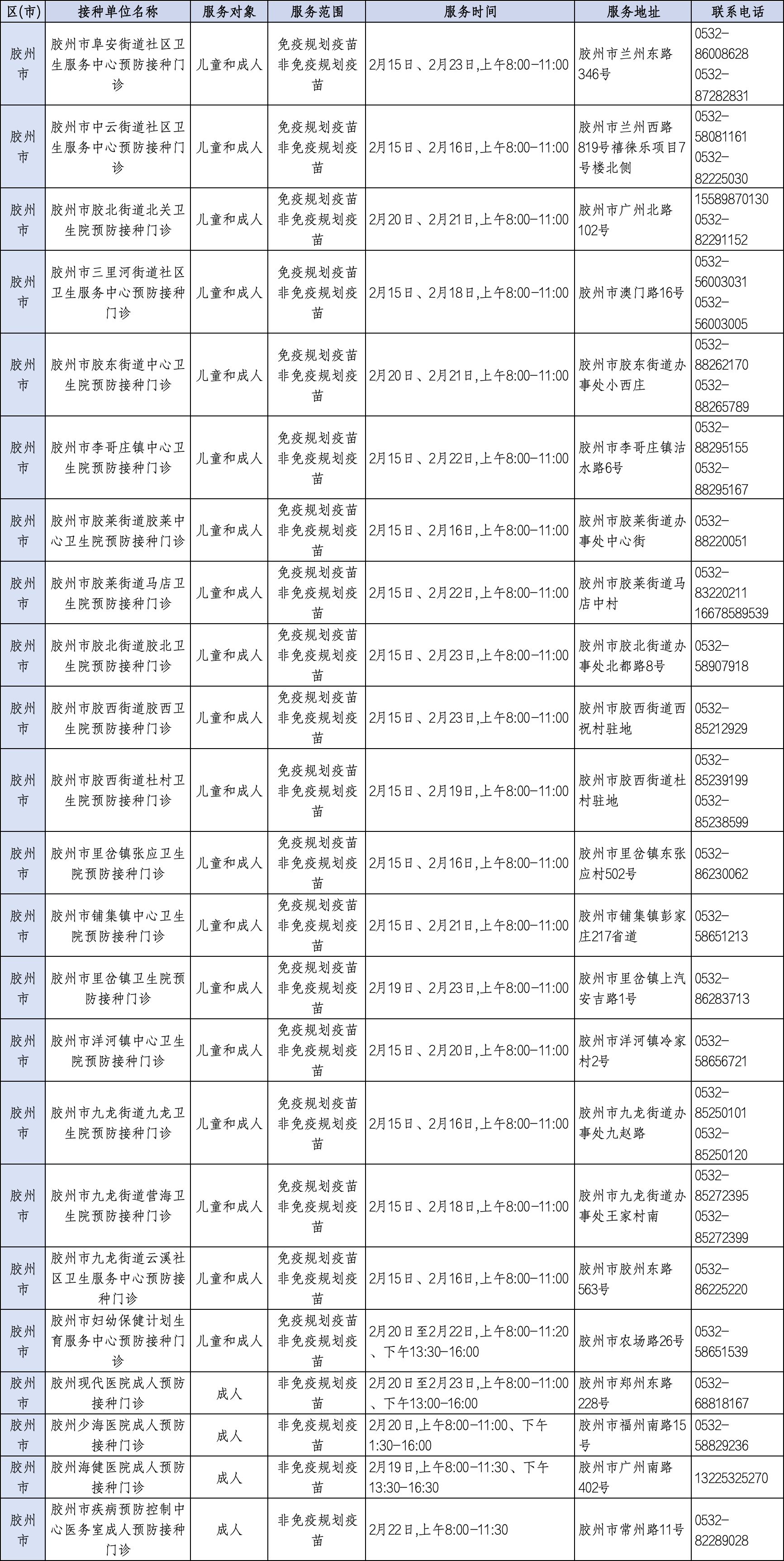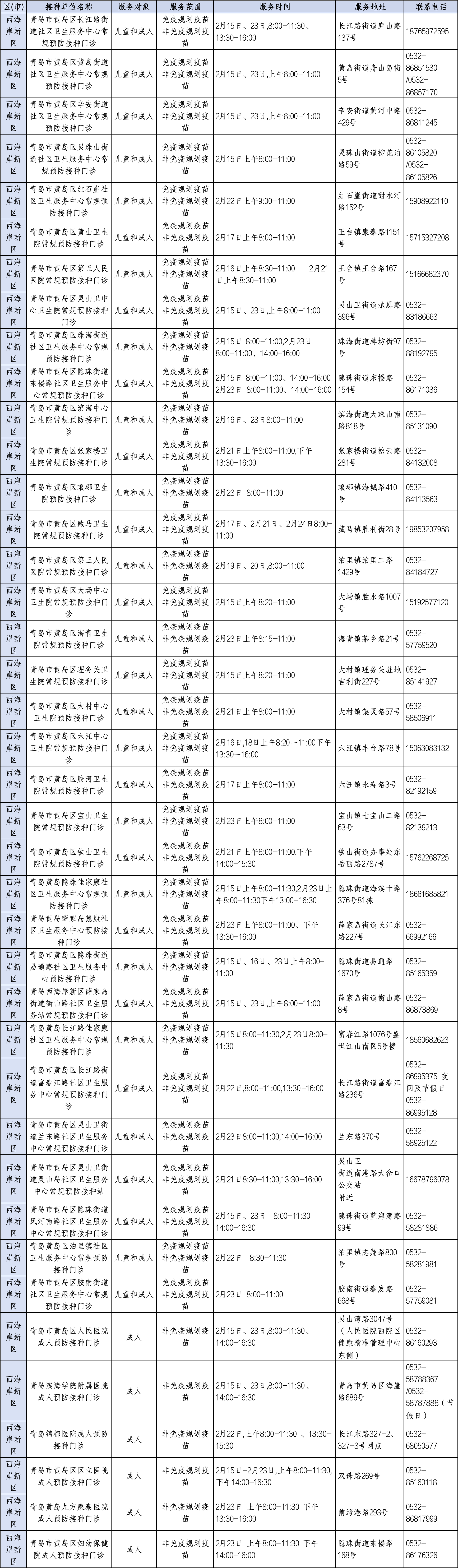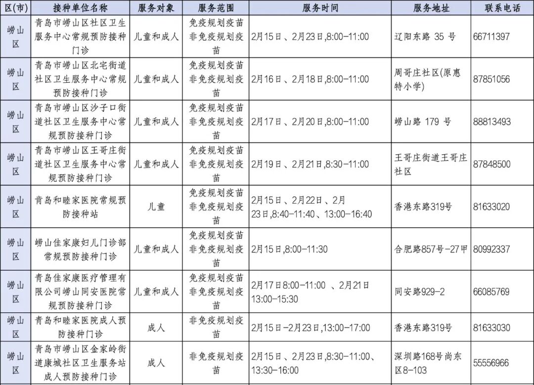 青岛日报社/观海新闻2月11日讯 为满足广大市民春节假期疫苗接种需求,守护大家平安健康过佳节,近日,青岛市疾控中心将青岛春节期间预防接种门诊开诊信息公示如下,有接种需求的市民朋友可就近选择门诊接种。
