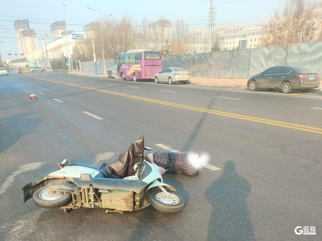 当天,董玉贤上班经过胶州市泸州路近柳州路路口处时,远远看到一位老人趴在马路中央。身旁和身后十几米,是倒地的电动车和红色头盔。董玉贤见状跑上前查看老人伤情,发现老人能简单沟通,但四肢活动受限,动弹不得。董玉贤立刻拨打110和120,而后将老人的红色头盔放置在车后不远处,充当临时警示标志。等待过程中,在穿梭的车流里,董玉贤始终守护在老人身边,轻声安慰。
