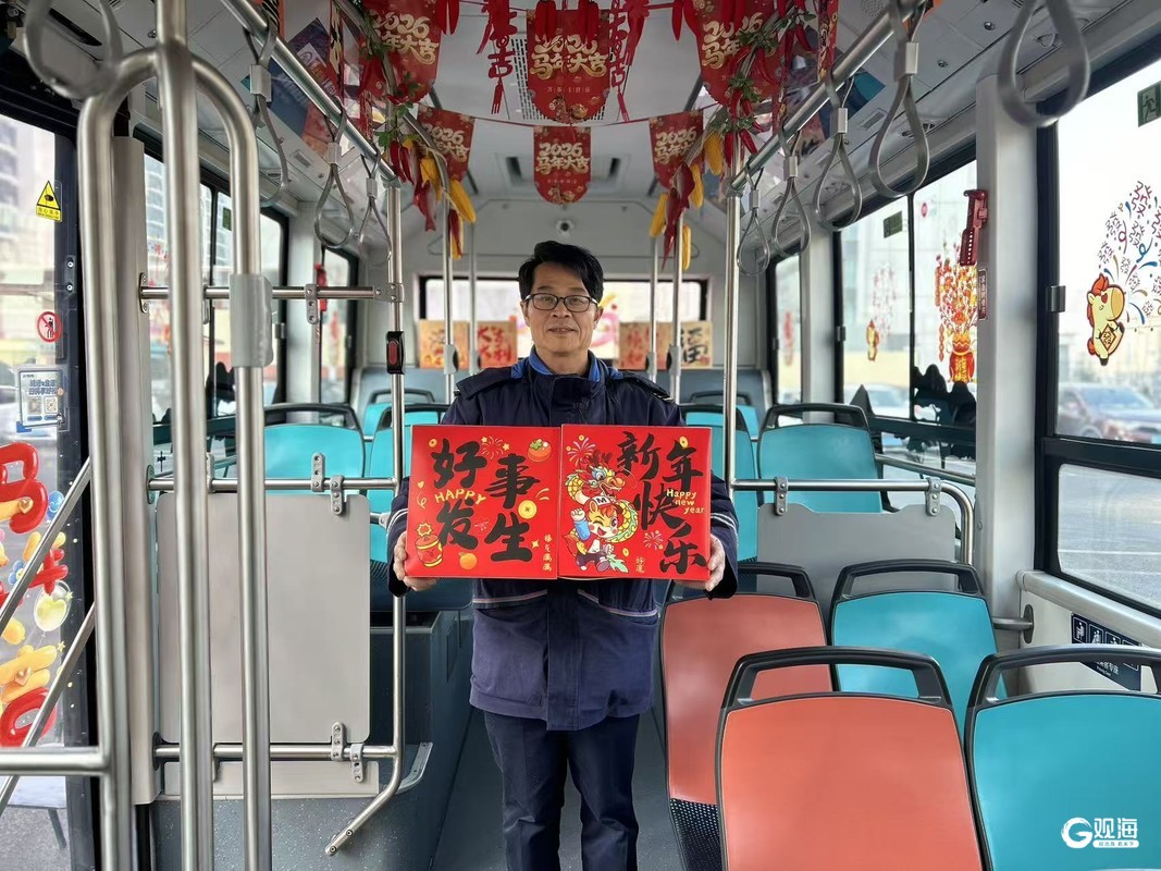 这辆装满年味的公交车,穿行在城市街头。车窗上的福字映着乘客们的笑脸,保温箱里放着对团圆的期待。李刚转动方向盘,也转动着这份属于平凡生活的温暖。当车门一次次开合,上下的不只是乘客,还有这座城市最质朴的温情。年,就这样在车轮转动中越来越近;暖,就这样在车厢里静静流淌。(青岛日报/观海新闻记者 周建亮 通讯员 高清)