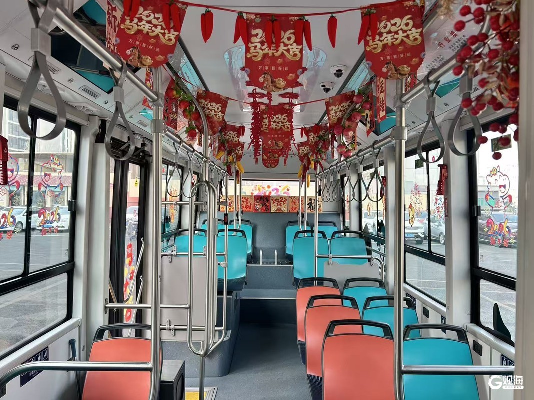登上DD2201号公交车,瞬间的视觉转换让人忘却冬日的寒意。平日里简洁明快的公交空间,此刻被精心改造成一个沉浸式的“年味小世界”。车窗玻璃上,2026年生肖“马”的卡通贴纸跃然眼前,它们灵动可爱的造型不仅烘托出节日的欢快气氛,更承载着“马到成功”“龙马精神”等传统吉祥寓意,为奔波的旅途注入新春的蓬勃朝气与美好期许。