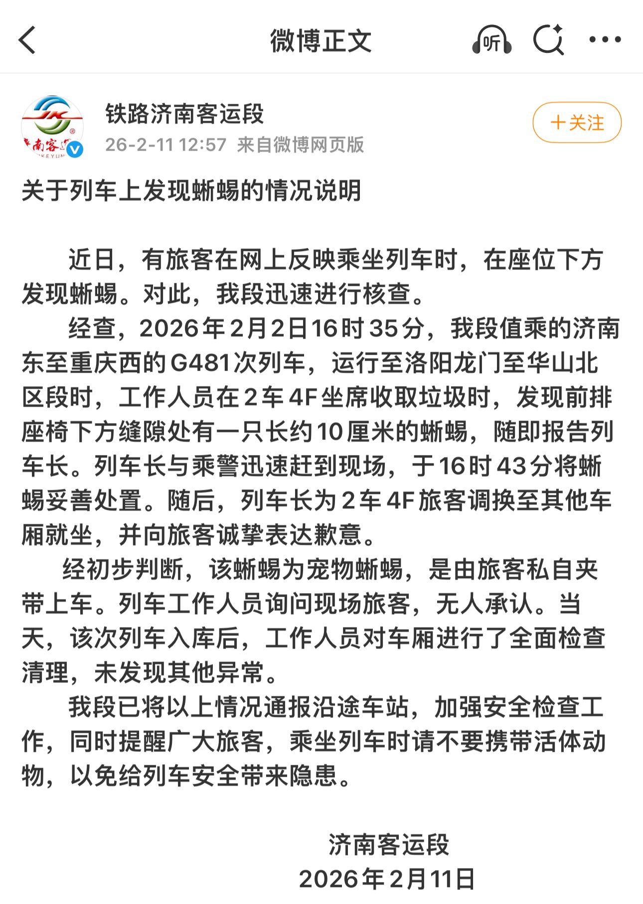 经查,2026年2月2日16时35分,我段值乘的济南东至重庆西的G481次列车,运行至洛阳龙门至华山北区段时,工作人员在2车4F坐席收取垃圾时,发现前排座椅下方缝隙处有一只长约10厘米的蜥蜴,随即报告列车长。列车长与乘警迅速赶到现场,于16时43分将蜥蜴妥善处置。随后,列车长为2车4F旅客调换至其他车厢就坐,并向旅客诚挚表达歉意。