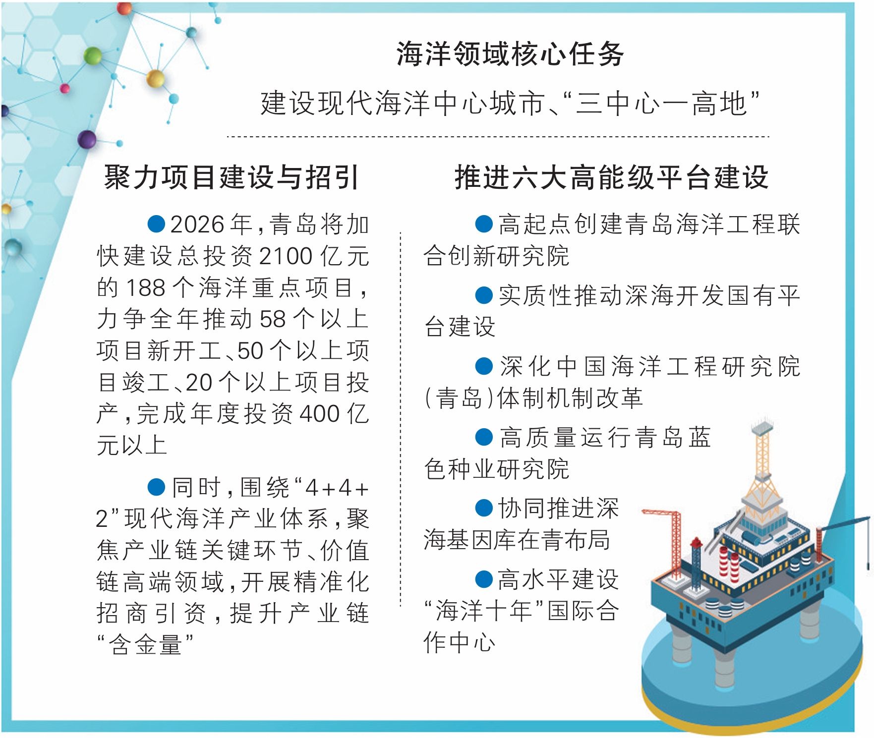 为推动“4+4+2”现代海洋产业体系积厚成势,2026年,青岛将紧扣产业变革趋势,在项目推进、招商引资、产业培育等方面协同发力,进一步推动海洋产业向高端化、智能化、绿色化、集群化发展。