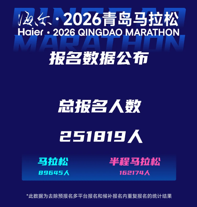 海尔·2026青岛马拉松报名数据公布 2026-02-12 13:54 青岛国际马拉松 0 每一组跳动的数字 每一份滚烫的热度 承载万干跑者对青马的厚爱与关注 诚挚感谢您的信任与奔赴 让赛事因热爱而充满温度 2026年4月19日 春日胜景不负期待 魅力山海见证奔跑力量 责任编辑:岳文燕