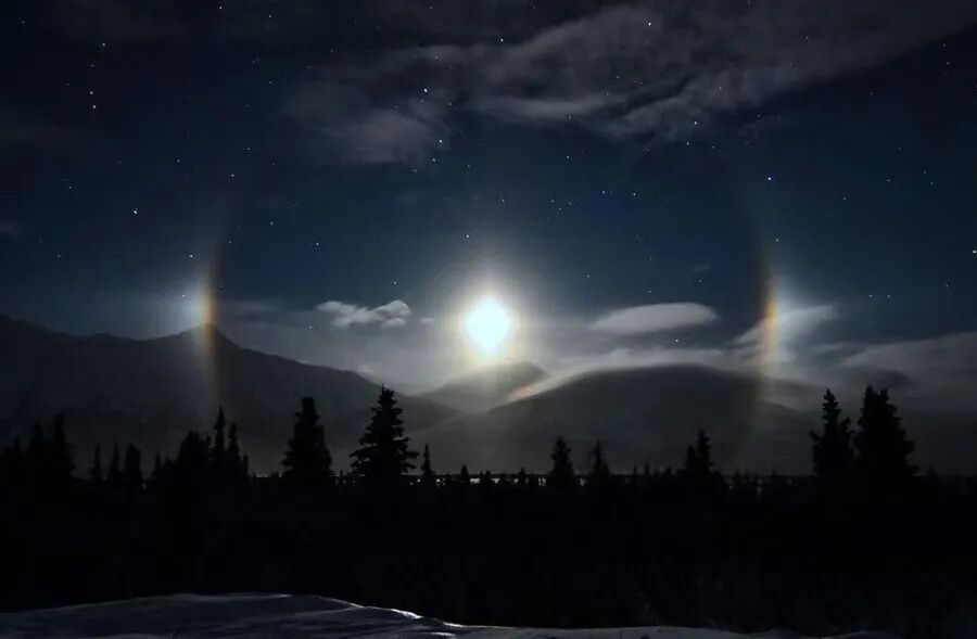 而真正的“幻月”,则是一种罕见的大气光学现象。幻日和幻月,主要是由大气中的小冰晶折射太阳光或月光后形成的。幻日或幻月最容易出现在天气寒冷且高空存在薄薄卷云的天气条件下,且太阳或月亮处在特定高度,此时云层中的小冰晶会折射光线形成幻日或幻月。