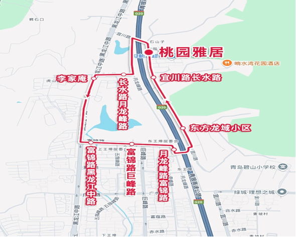 自“桃园雅居”始发站,沿宜川路、无名路、长水路、黑龙江中路、富锦路、月龙峰路、无名路、宜川路至“桃园雅居”车站止。