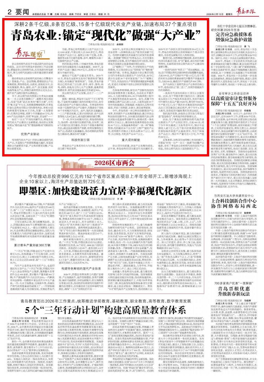 站在“十五五”开局的关键节点,青岛农业现代化大产业建设正全面提速,推动农业发展实现从“稳住基本盘”到“塑造新格局”的阶段性跃升。
