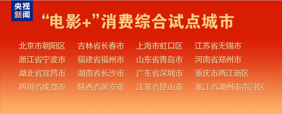 根据有关省市择优选报,北京市朝阳区、吉林省长春市、上海市虹口区、江苏省无锡市、浙江省宁波市、福建省福州市、山东省青岛市、河南省郑州市、湖北省宜昌市、湖南省长沙市、广东省深圳市、重庆市两江新区、四川省成都市、陕西省延安市,以及江苏省昆山市、浙江省湖州市南浔区16个城市为“电影+”消费综合试点城市。