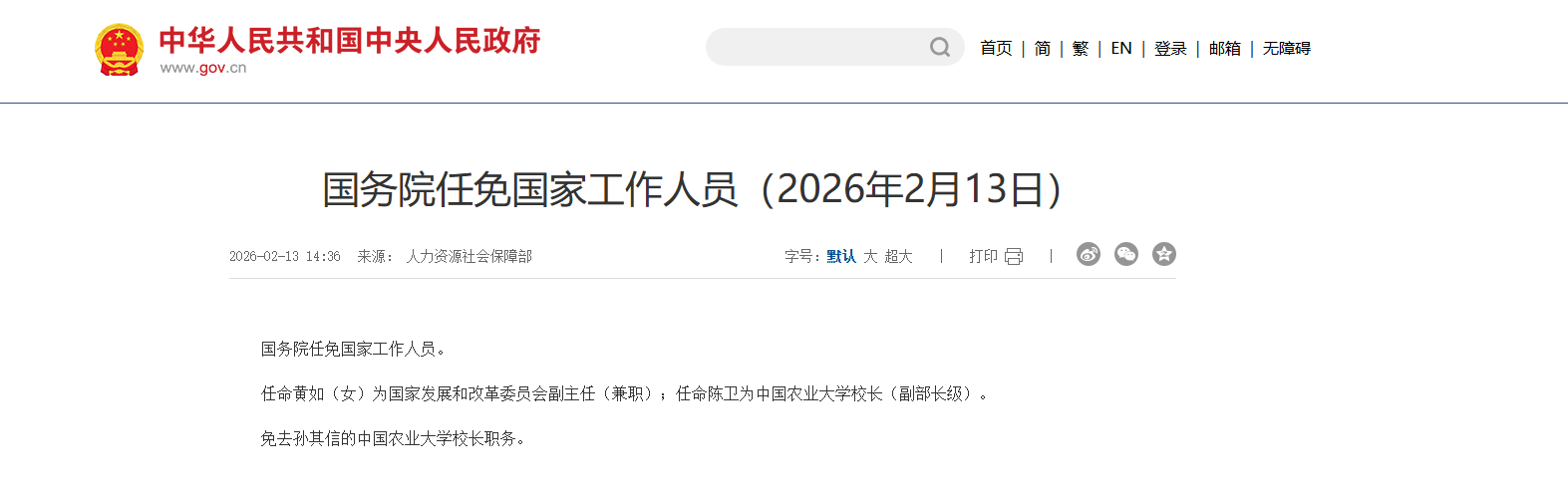 国务院任免国家工作人员 2026-02-13 15:11 新华社 0 新华社北京2月13日电 国务院任免国家工作人员。 任命黄如(女)为国家发展和改革委员会副主任(兼职);任命陈卫为中国农业大学校长(副部长级)。 免去孙其信的中国农业大学校长职务。 责任编辑:王逸群