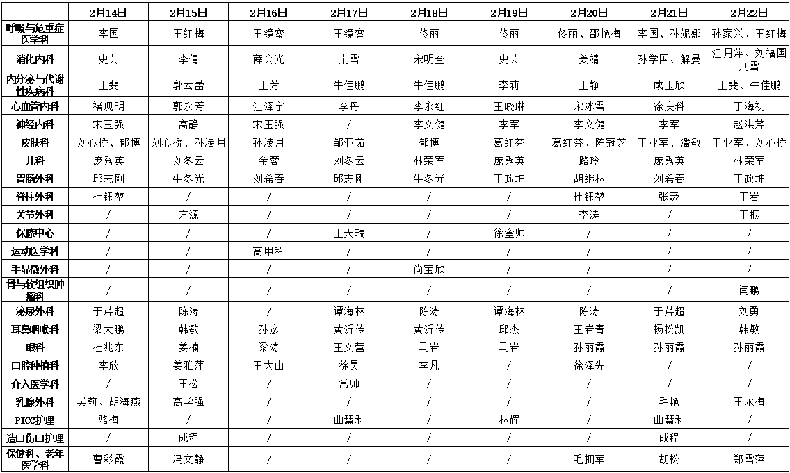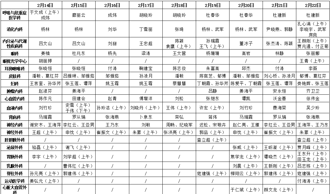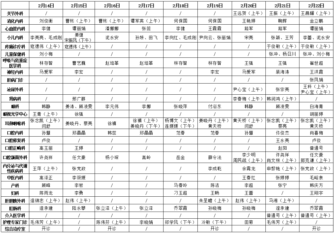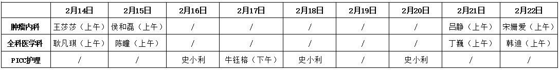 肿瘤内科、全科医学科门诊时间:2月14日、15日、21日、22日上午8:00-12:00