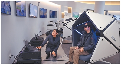 游客在体验丹拿XEO+POD沉浸式娱乐座舱和XEO+BIG单目4K超轻VR头戴式显示器。谢明摄