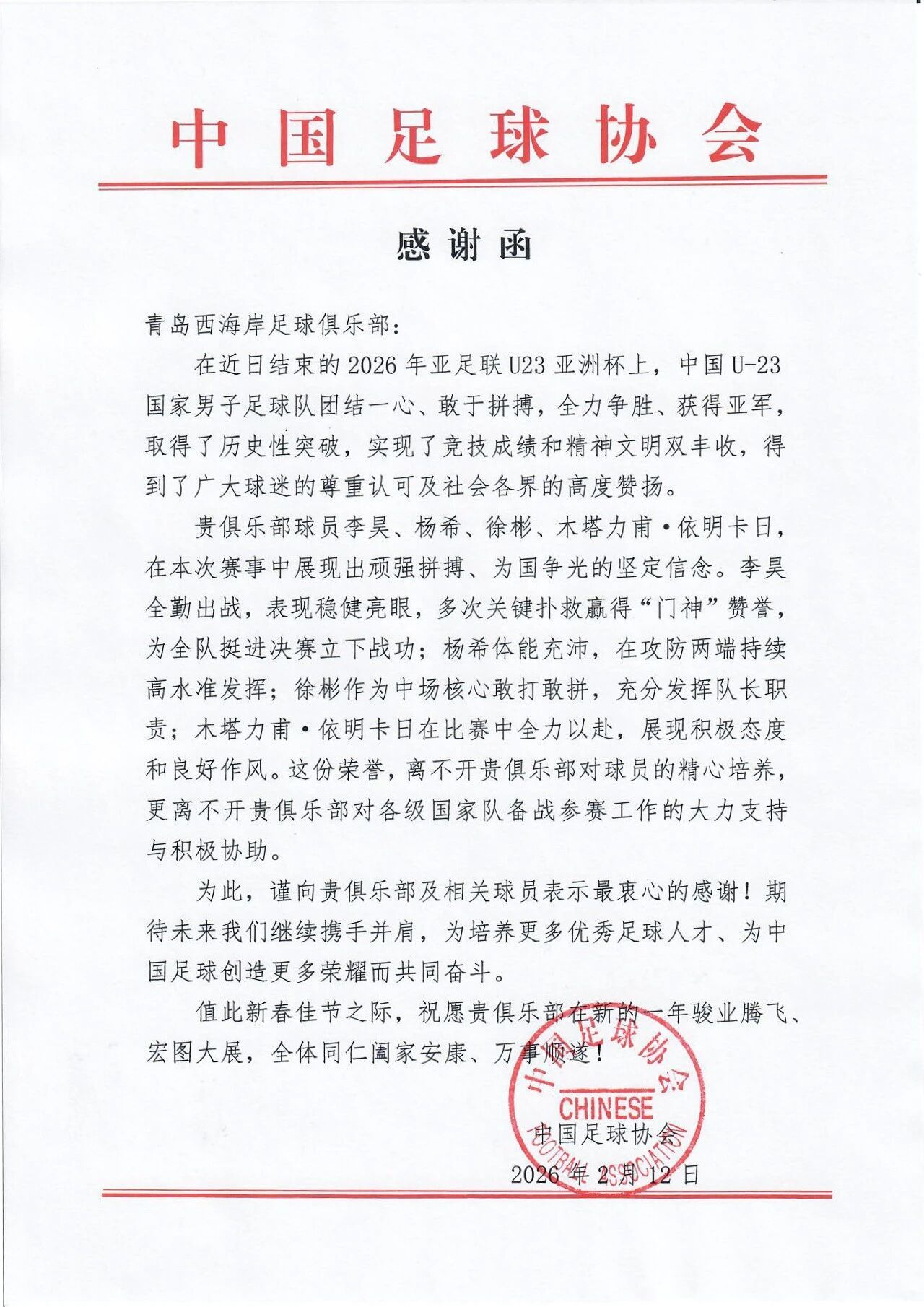 中国足协在感谢函中表示:在近日结束的U23亚洲杯赛中,中国U-23国家男子足球队团结一心、奋勇拼搏,斩获亚军,实现历史性突破。西海岸足球俱乐部的四位球员作为国脚,以顽强斗志与专业素养,在赛场上赢得了广大球迷的尊重认可及社会各界的高度赞扬。李昊全勤出战,多次关键扑救力保城门,赢得 “门神” 赞誉;杨希体能充沛,攻防两端持续高水平输出;徐彬作为中场核心,扛起队长职责,引领球队节奏;木塔力甫・依明卡日全力以赴,以积极态度与良好作风诠释拼搏精神。