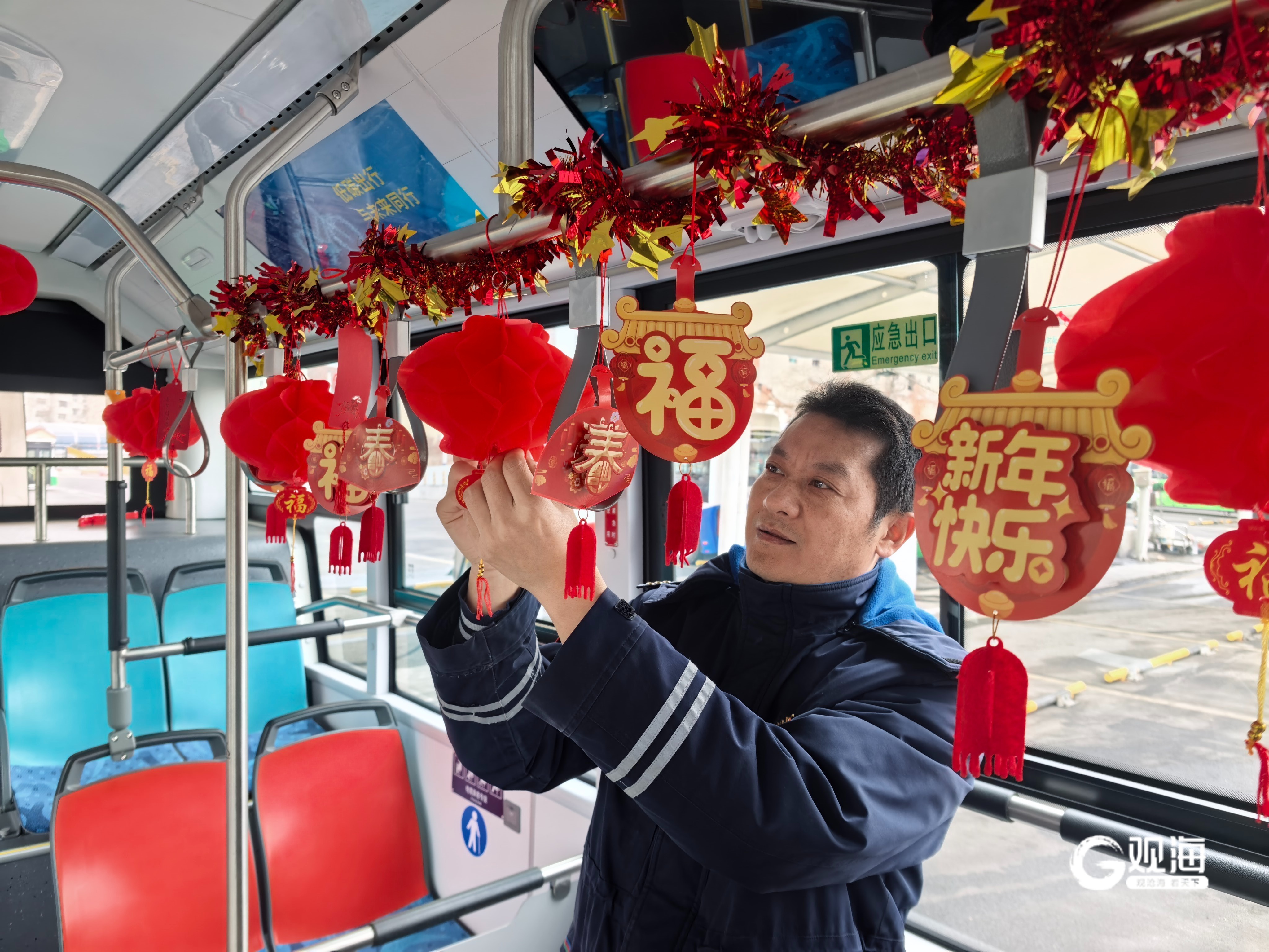 在这辆215路主题巴士上,吴相月利用休息时间精心布置,将十米车厢变身流动新春驿站。车厢内彩带飘扬、新年拉花错落悬挂,红彤彤的福字与吉祥窗花格外喜庆亮眼。他还特别设置了新年许愿卡区域,邀请乘客写下新年心愿与祝福,让每一趟出行都满载期许与暖意。整洁温馨的环境、扑面而来的年味,让乘客一上车便感受到家一般的温馨,纷纷点赞这趟“开往春天的幸福班车”。