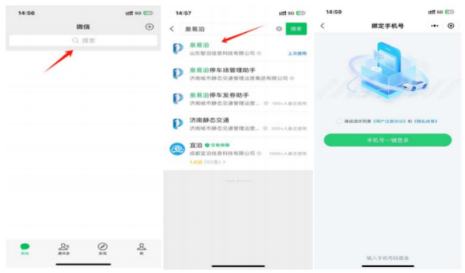 方法一:在微信、支付宝顶部搜索栏搜索“泉易泊”,进入到“泉易泊”小程序的界面。点击“手机号一键登录”,选择绑定的手机号,完成小程序的注册登录。