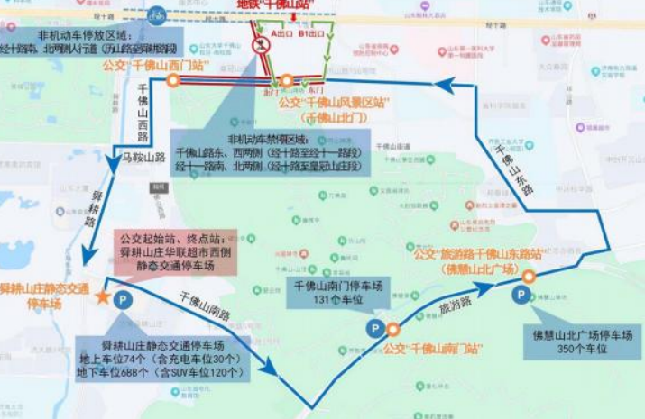 七、倡导游客绿色出行,优选公交、地铁等公共交通方式。乘坐地铁的游客,可在地铁 4 号线“千佛山站”A 出口出站,沿经十路西行至千佛山路,南行到达千佛山景区北门;或在 B1 出口出站,沿经十路东行至历山路,南行到达千佛山景区东门(附件1)。自驾游客可在微信、支付宝中使用“泉易泊”小程序(使用方法详见附件 2),搜索“千佛山风景名胜区”,查看附近停车场信息、剩余泊位及道路停车优惠政策。