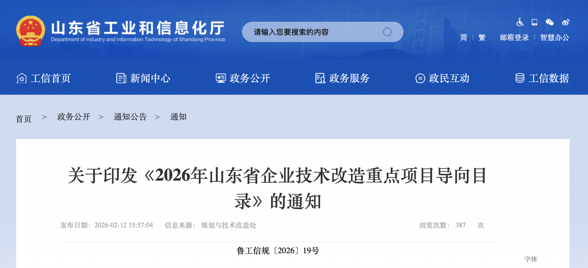 近日,山东省工业和信息化厅等部门联合印发《2026年山东省企业技术改造重点项目导向目录》。《导向目录》共包含高端化改造、智能化改造、绿色化改造、安全化改造四个方向共1610个项目,总投资达61333688.49万元。