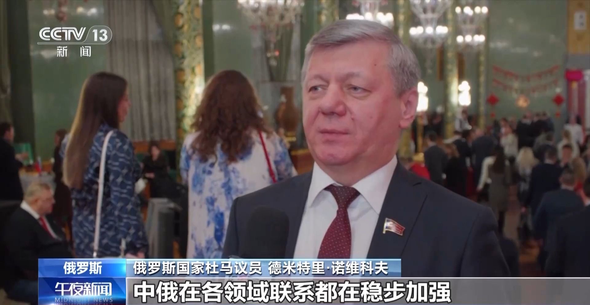 俄罗斯国家杜马议员 德米特里·诺维科夫:从贸易额增长到文化体育交流,中俄在各领域联系都在稳步加强,如今中国积累了独特的发展经验,值得俄罗斯深入研究,借鉴其中最精华、最宝贵的部分。相信新的一年,中国必将取得新的成就,实现新的突破。