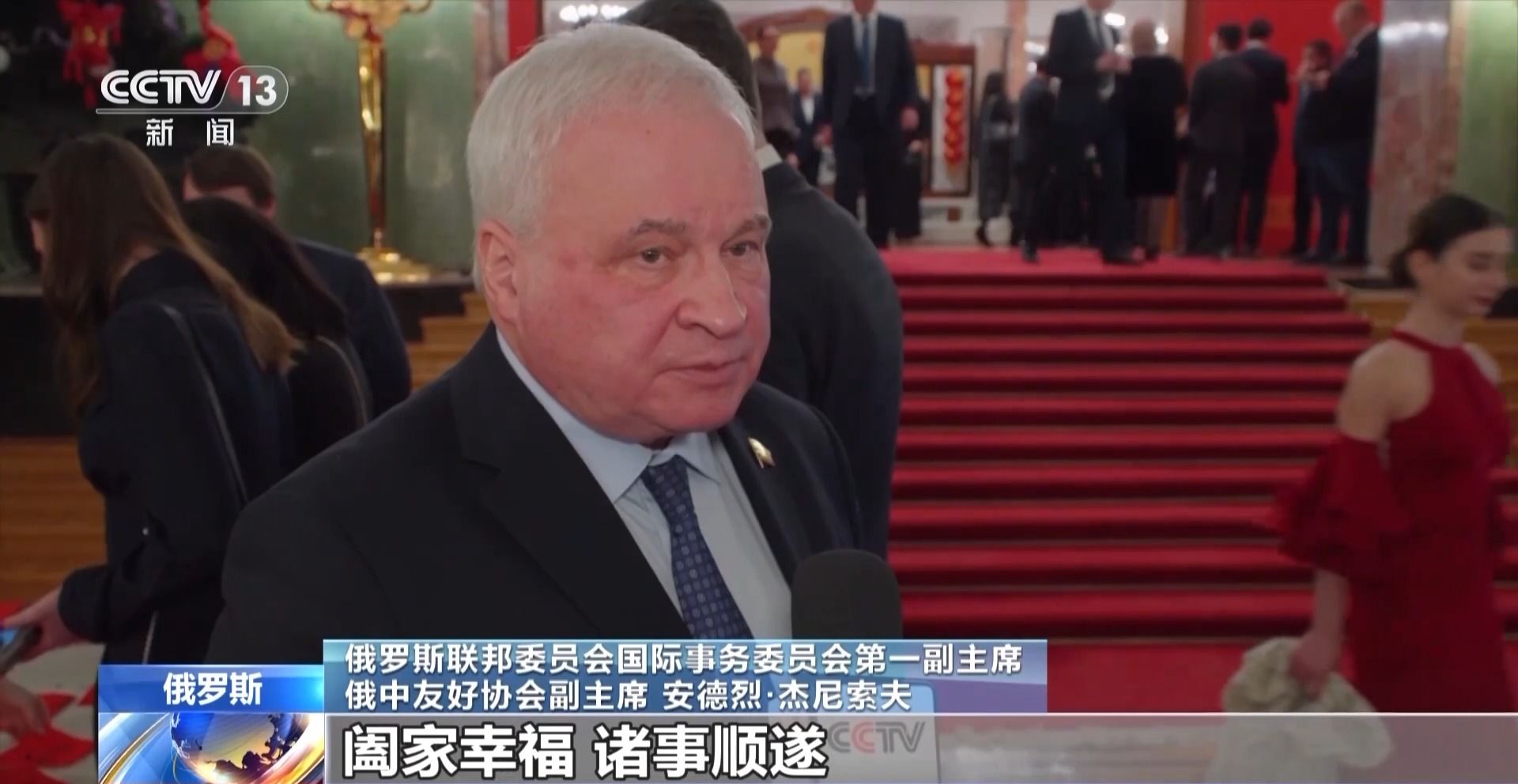 俄罗斯联邦委员会国际事务委员会第一副主席 俄中友好协会副主席 安德烈·杰尼索夫:中国人喜欢祝愿身体健康,阖家幸福,诸事顺遂,中文是“万事如意”,这也是我想送上的祝福。