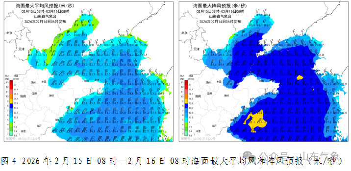 海上大风警报:14日白天,渤海和渤海海峡南风5~6级转北风6~7级阵风8级,黄海北部和中部南风5~6级;14日夜间,渤海和渤海海峡北风6~7级阵风8级增强到7级阵风8~9级,黄海北部和中部南风5~6级转北风7级阵风8~9级;15日白天到夜间,北风,渤海和渤海海峡7级阵风8~9级减弱到5~6级,黄海北部和中部7级阵风8~9级;16日白天到夜间,黄海北部和中部北风7级阵风8~9级减弱到5~6级,渤海和渤海海峡北风转南风5~6级。