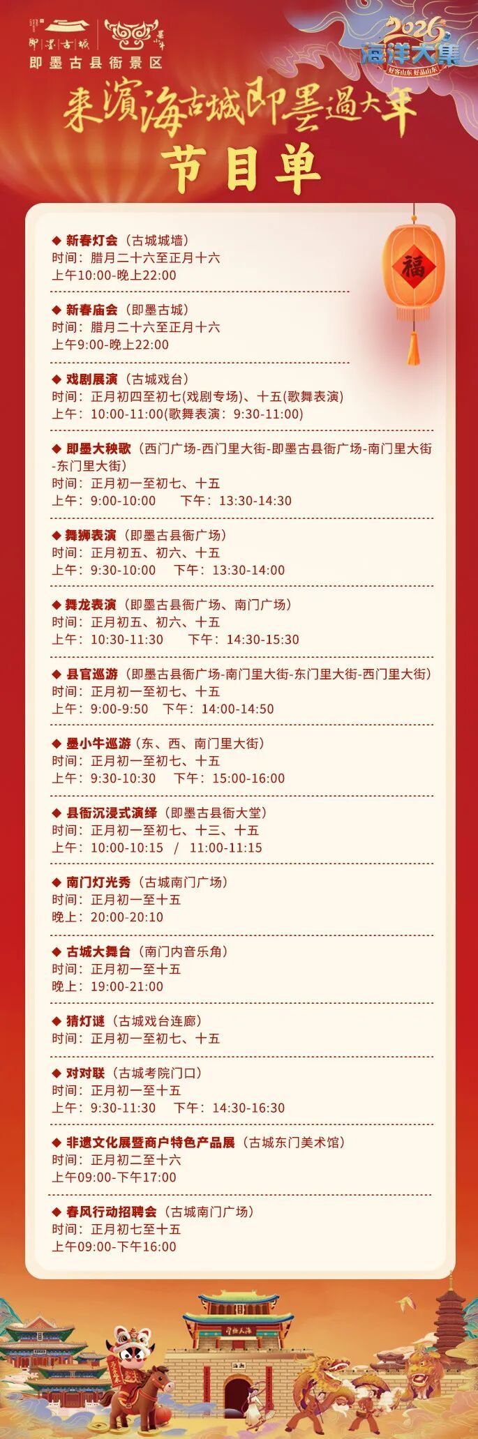 即墨古城新春庙会将于腊月二十六开启。庙会与美食街烟火升腾,特色美食撩动味蕾。正月初一起,传统节目演艺好戏连台,即墨柳腔、舞龙舞狮、即墨大秧歌、特色巡游等民俗表演轮番上演,让市民沉浸在新年欢乐氛围中。在这里,市民可尽情逛庙会、品美食、赏民俗,感受胶东春节浓浓的烟火气。
