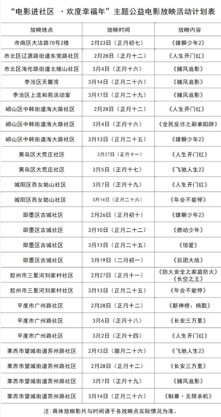 此次“电影进社区·欢度幸福年”活动放映范围广、持续时间长,挑选的影片兼顾主流价值观传递与市民观影喜好,其中包括《人生开门红》《年会不能停》等包含烟火气的热门喜剧片,也有《长安三万里》《新神榜:杨戬》等极具文化内涵的动画佳作,同时还有《百团大战》《长空之王》等主旋律大制作。主办方还推出了《全民反诈之刷单陷阱》《防火安全之家庭防火》等科普影片,贴合社区治理与民生需求。作为青岛文化惠民工程的重要组成部分,“电影进社区·欢度幸福年”让岛城居民在家门口就能享受到优质文化资源。据悉,本次放映活动将持续至3月下旬,后续还将结合青岛本地特色,推出更多贴合市民需求的主题影片放映活动。(青岛日报/观海新闻记者 米荆玉)