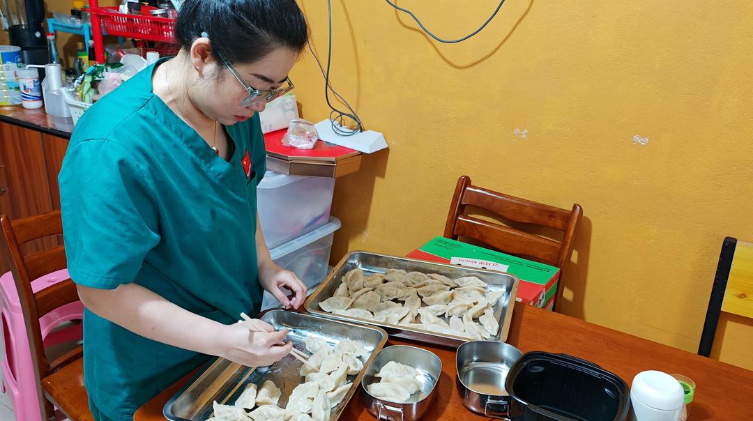 这是医疗队的第一个海外春节。除夕一大早,他们拿出早就囤好的四棵白菜和冻肉,剁馅、擀皮儿,包好饺子带到塔拉瓦中央医院的每周例会。“当地同事很爱吃饺子,趁过年再送一次,分享喜气。”唐晓杰说。