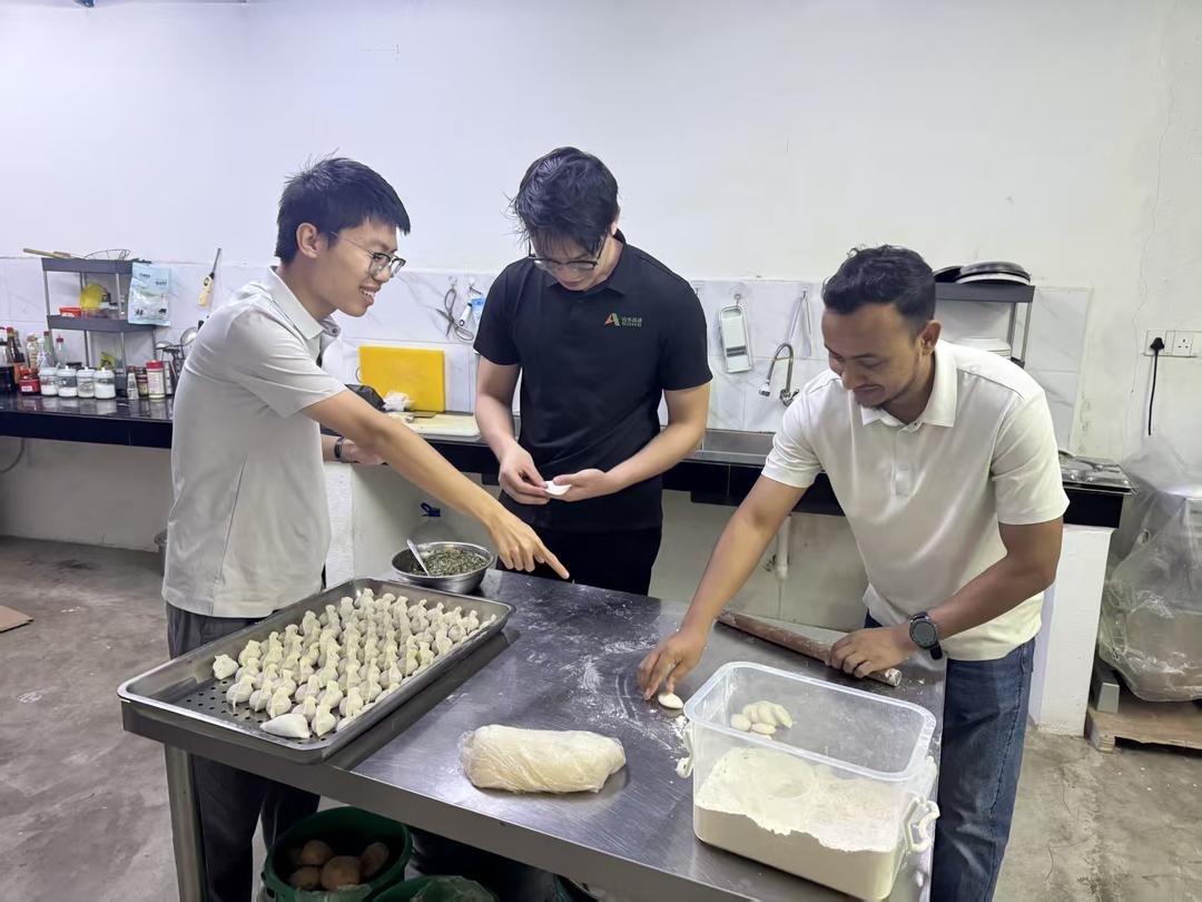 厨房里,项目员工姜涵正在和同事擀皮儿、拌馅,来自孟加拉国的项目工程师Jakaria Masud自告奋勇,教马来西亚的同事包水饺。不一会儿,马来西亚的同事就掌握了擀饺子皮的大致方法,虽然速度有点慢,擀出来的形状却是有模有样。“Masud从孟加拉国达卡机场高架快速路项目开始,就参与了山东高速集团项目的建设,已经是我们的老朋友了。”姜涵介绍。