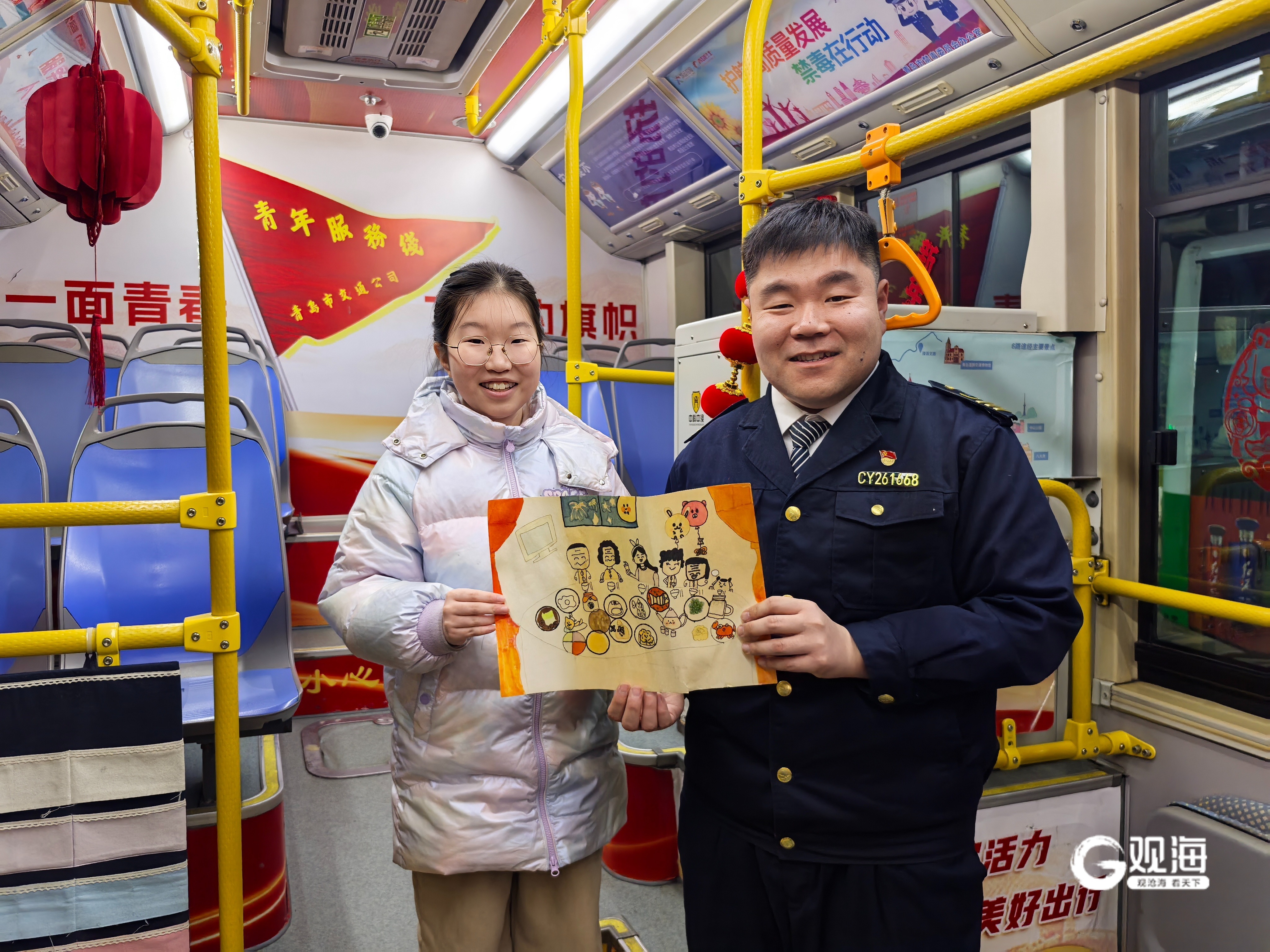 今年除夕傍晚,福州南路江西路公交站台,12路车缓缓驶出港湾。车厢里悬着几盏红色小灯笼,后挡板贴着“福”字窗花与祥云剪纸——这是高鸿霖和同事们提前布置的。“哪怕只有一位乘客,也希望他能感受到回家的温暖。”他说。